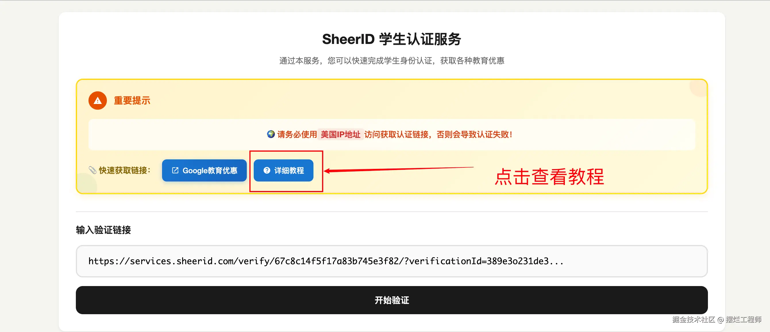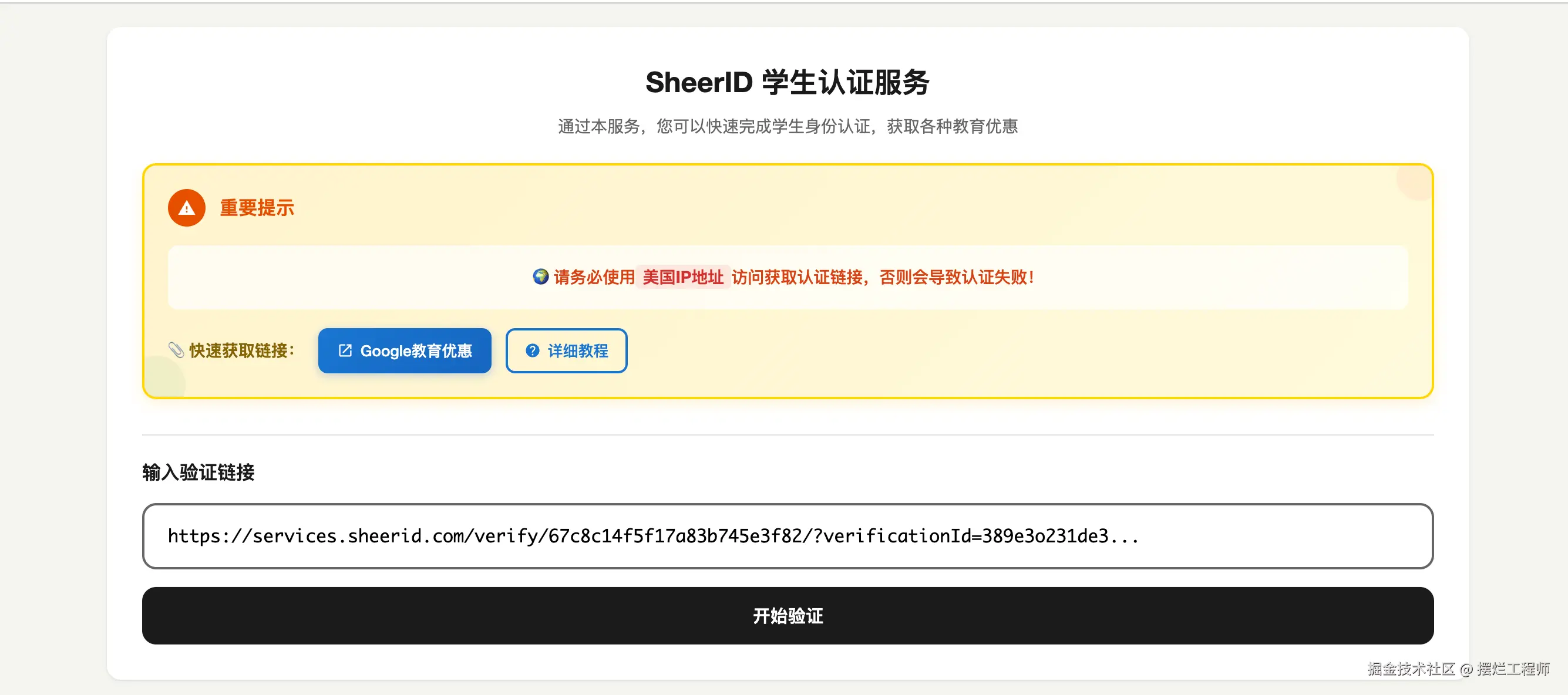 (4)到 Sheerid 一键认证系统,复制上你的Sheerid认证链接,粘贴进输入框,点击开始验证即可。 等待二十几秒左右就完成啦!