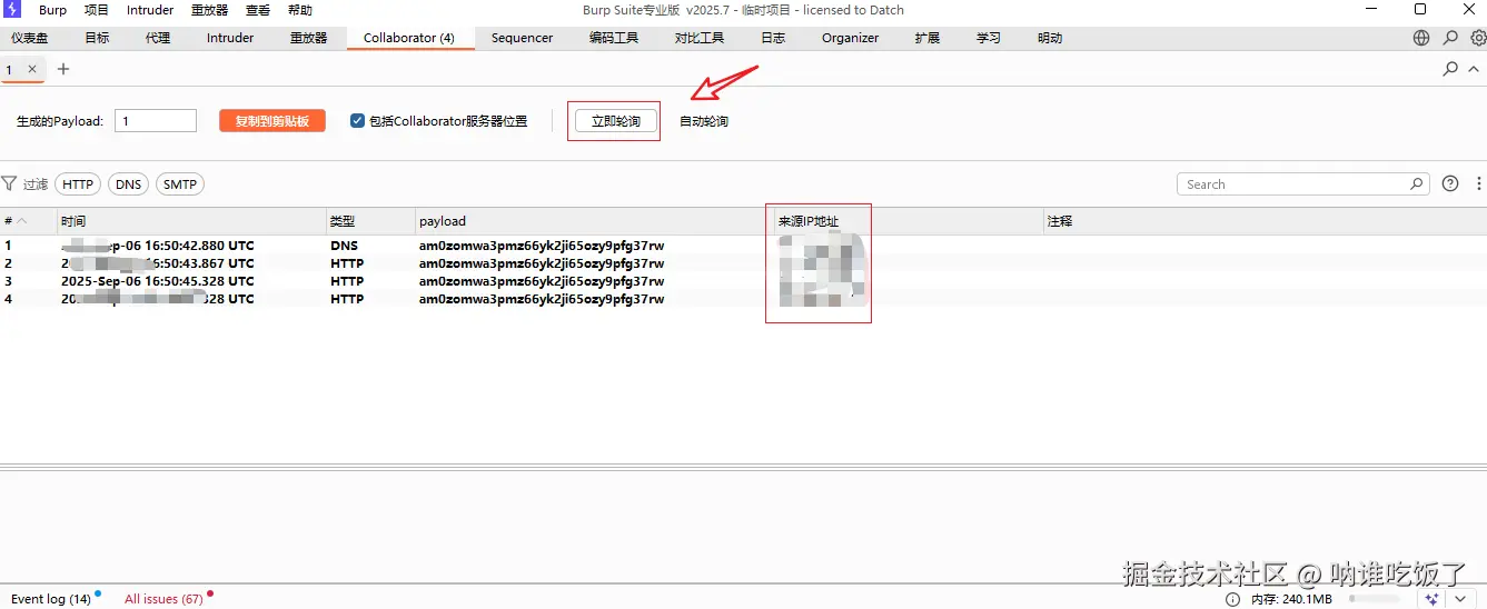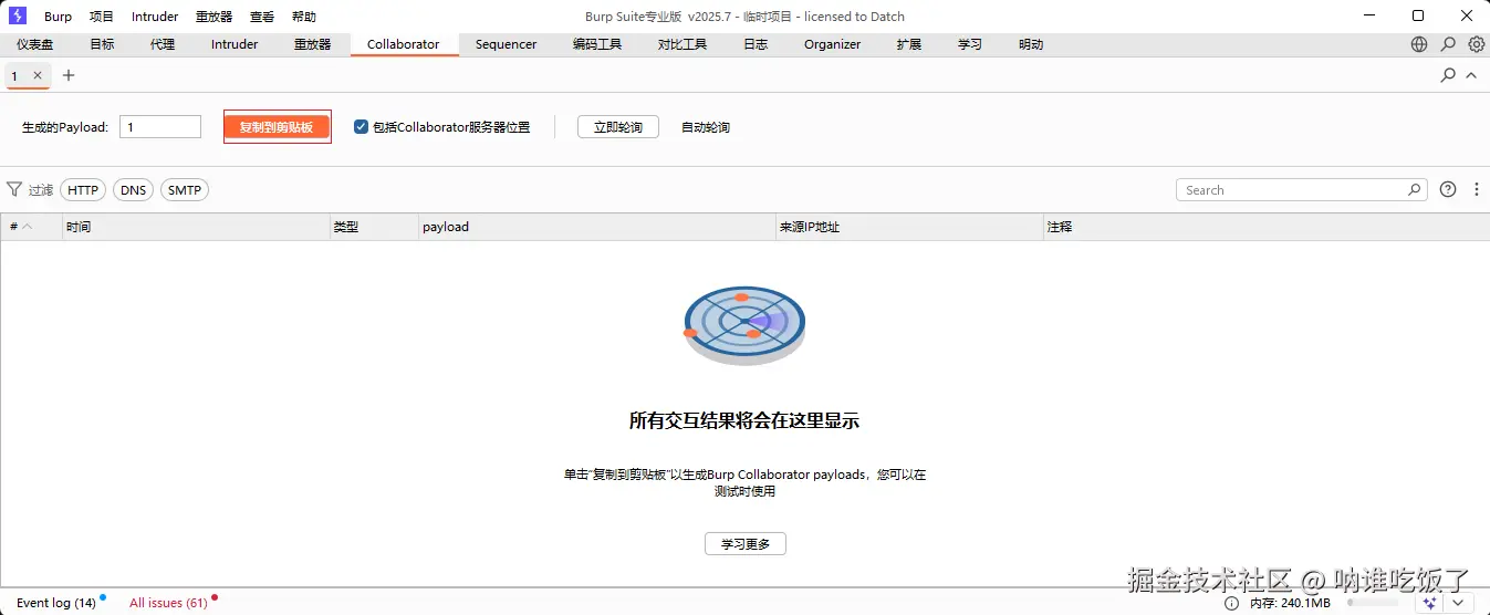 使用Burp内置的dnslog验证,打开Burp的dnslog模块: