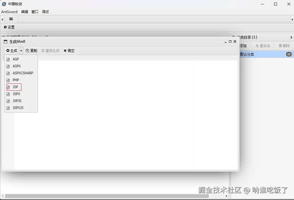 使用蚁剑生成webshell:Tomcat是java开发的所以类型要选择JSP。