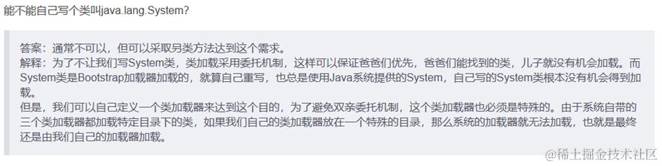假设你自己的类加载器用双亲委派,那么优先由启动类加载器加载真正的 java.lang.System,自然不会加载假冒的