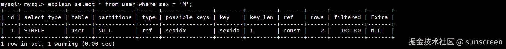 对sex字段创建索引后使用sex字段对应的索引查询,执行过程:其中type的值为ref,key值为sexidx。