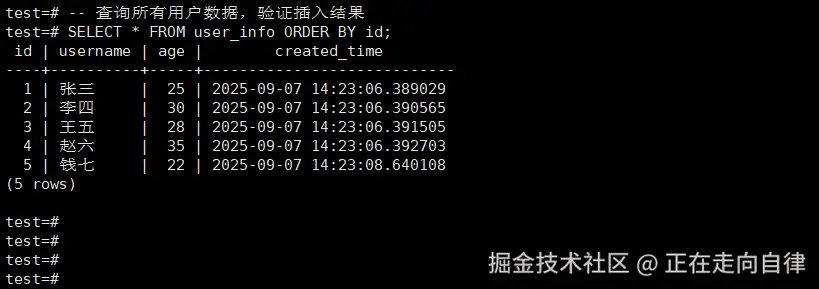 执行查询语句,查询所有用户数据,验证插入结果,如下图所示: