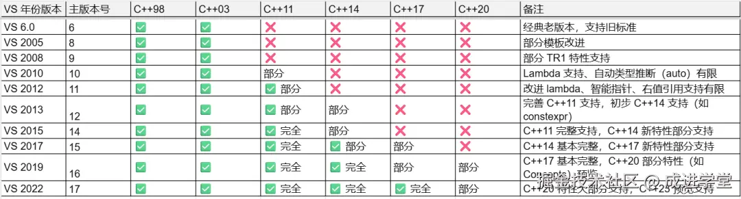 Visual Studio 各版本对应的 C++ 标准支持情况表,包括主要年份版本及对 C++ 标准的支持程度。
