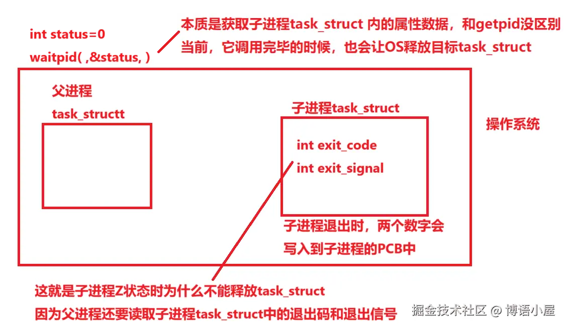 • wait和waitpid,都有一个status参数,该参数是一个输出型参数,由操作系统填充。