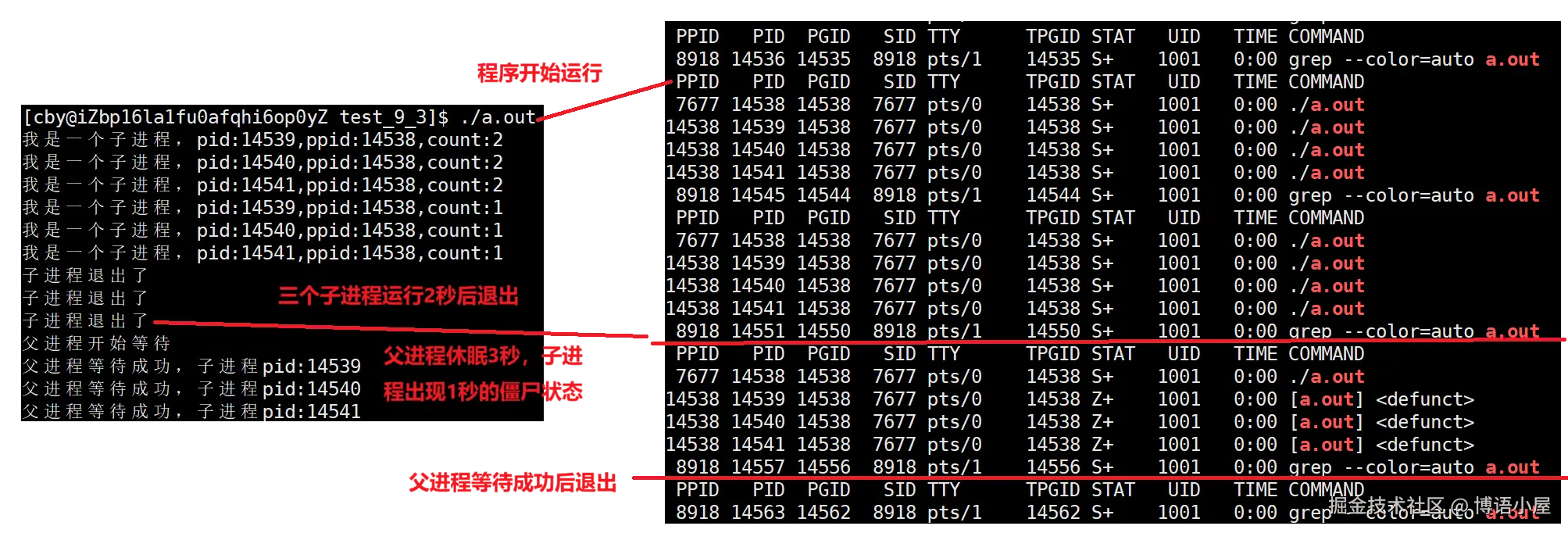 通过下面这段程序我们可以看到父进程调用wait解决子进程的僵尸状态
