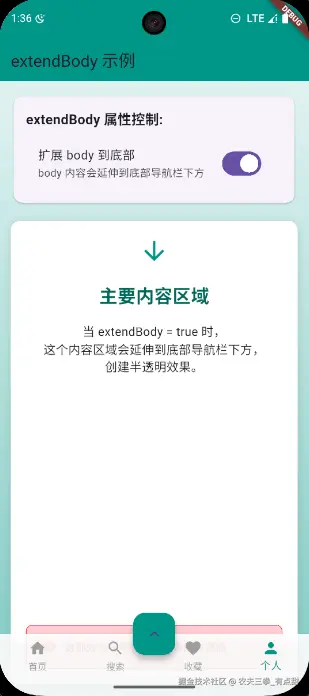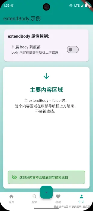 : '当 extendBody = false 时,\n这个内容区域在底部导航栏上方结束,\n不会被遮挡。',