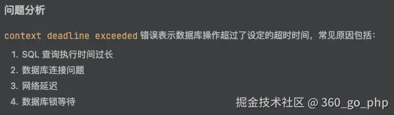 在分布式系统或复杂应用中,context deadline exceeded 错误常常表明数据库操作超出了设定的最大执行时间。这种错误通常是在执行 MySQL 查询时发生,尤其是在网络延迟、数据库负载过高或者查询本身效率较低时。