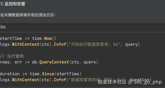 为了提高日志的可读性和追踪性,可以在日志中增加更多的上下文信息,例如数据库查询的 SQL 语句、查询时长等。