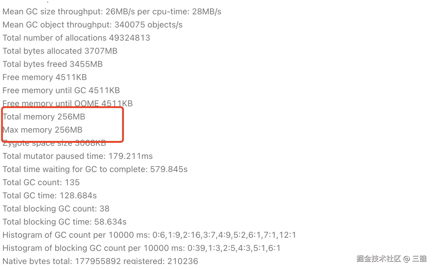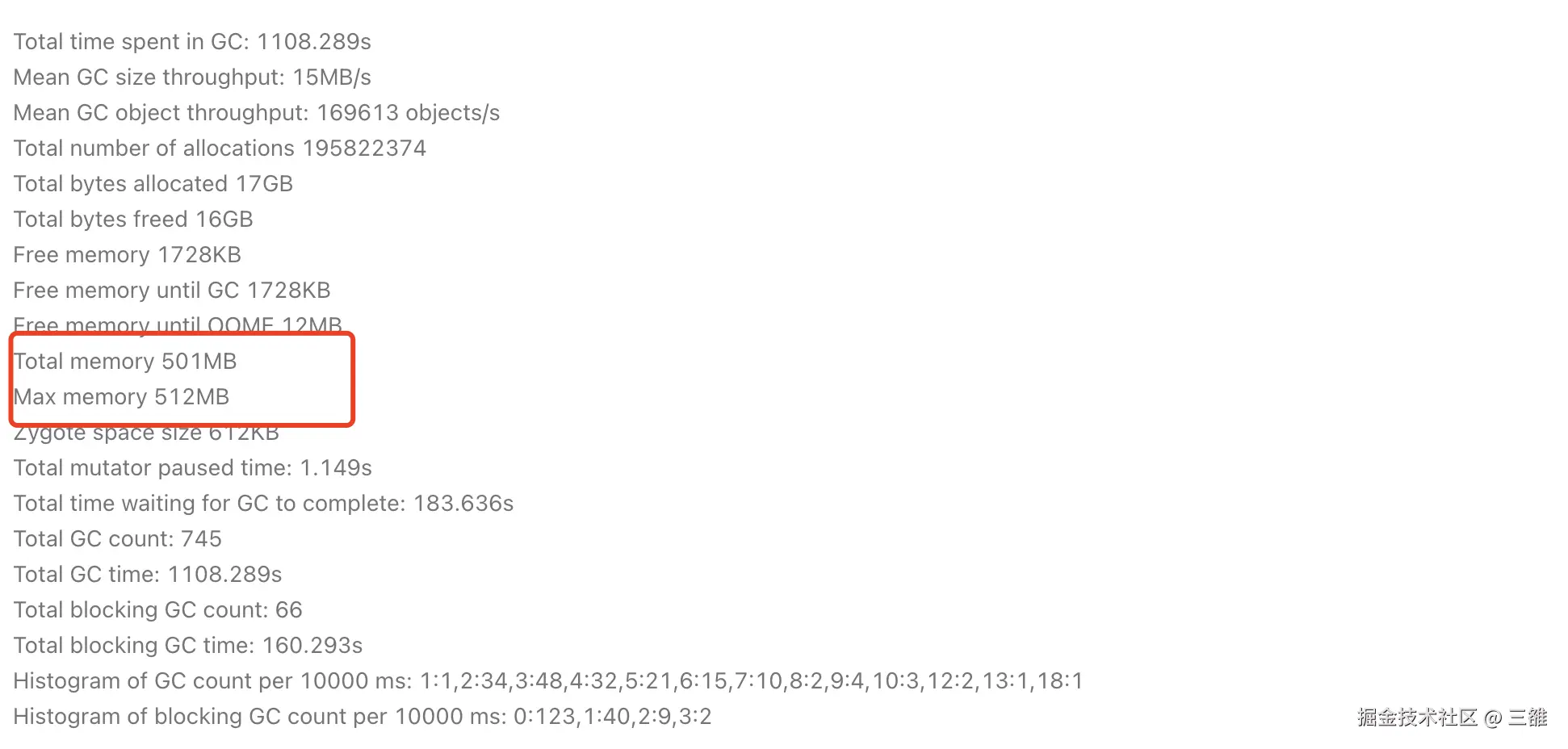 分析堆栈可以看出发生在主线程new新对象,在堆上分配空间的过程中,而且都会调用到AllocateInternalWithGc方法。根据我们对ART虚拟机分配对象过程中的代码分析,只有分配对象使内存触顶,将要触发OOM时候才会调用AllocateInternalWithGc方法触发Alloc GC, 那么也就是说这些ANR基本都发生在临近OOM时候。要想验证这一点并不难,我们只需要看ANR时候虚拟机当前的totalMemory是否接近maxMemory,由于GP上没有这些信息,从APMS搜索WaitForGcToCompleteLocked 相关的ANR查看相关信息, 可以看出大部分都是内存触顶的,比如: