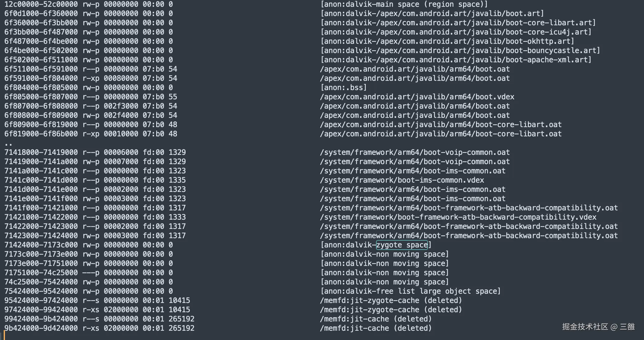 通过 maps 文件可以看到,12c00000 到 52c00000 的地址范围是1G,属于 MainSpace。从 6f0d1000 到 71424000 属于 ImageSpace,约40M大小,存放了各个系统相关的库。紧跟着 ImageSpace 的便是 ZygoteSpace、Non Moving Space 和 Large Object Space。
