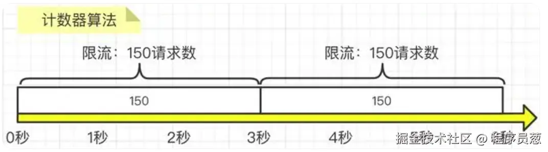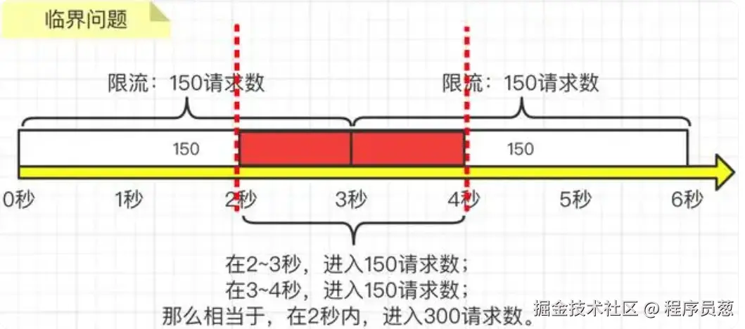 这种方式存在临界问题即:如果第2到3秒内产生了150次请求,而第3到4秒内产生了150次请求,那么其实在第2秒到第4秒这两秒内,就已经发生了300次请求了,远远大于我们要求的3秒内的请求不要超过150次这个限制