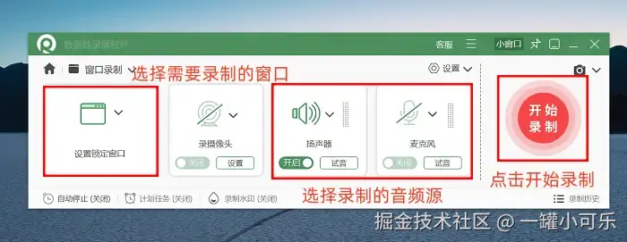 步骤2:选择录制窗口,然后就可以选择音频源了。勾选系统声音可以捕获软件音效,开启麦克风能同步人声讲解。还可以点击齿轮图标进入 “输出设置” ,从分辨率到帧率,从编码格式到输出格式都能进行设置。确认所有设置后,点击醒目的红色圆形按钮开始录制视频。