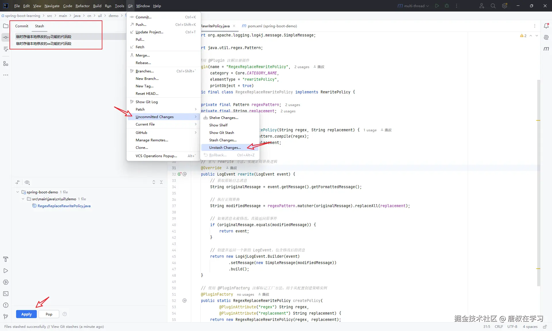 唐叔提示:这与git stash类似,但IDEA提供了更可视化的管理界面,可以 selectively shelve(选择性暂存)部分修改,更加灵活。