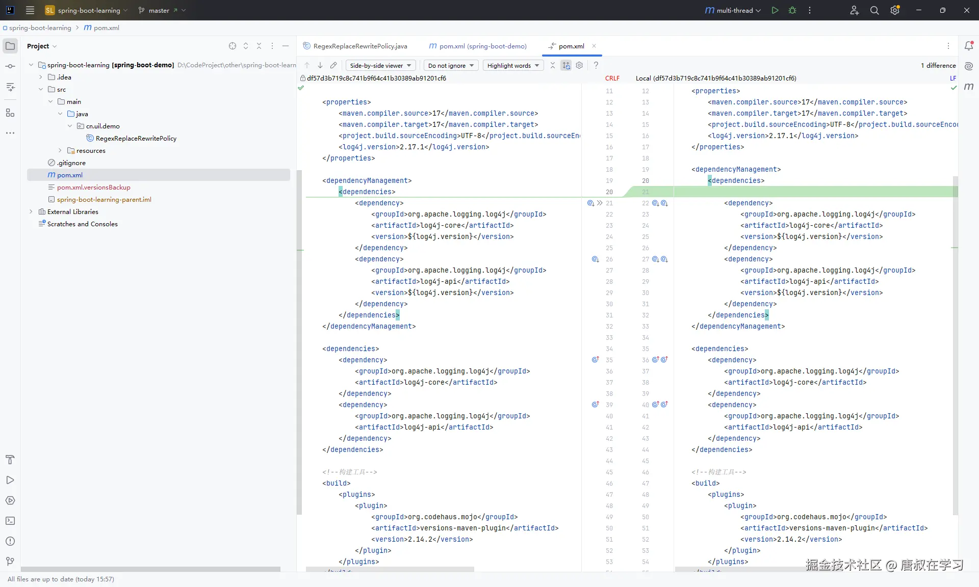 实战技巧:比较不同分支时,IDEA会打开一个强大的对比视图,可以清晰地看到文件级别的变化,甚至可以细化到代码行级别的差异。这对于代码审查和版本回溯极其有用!