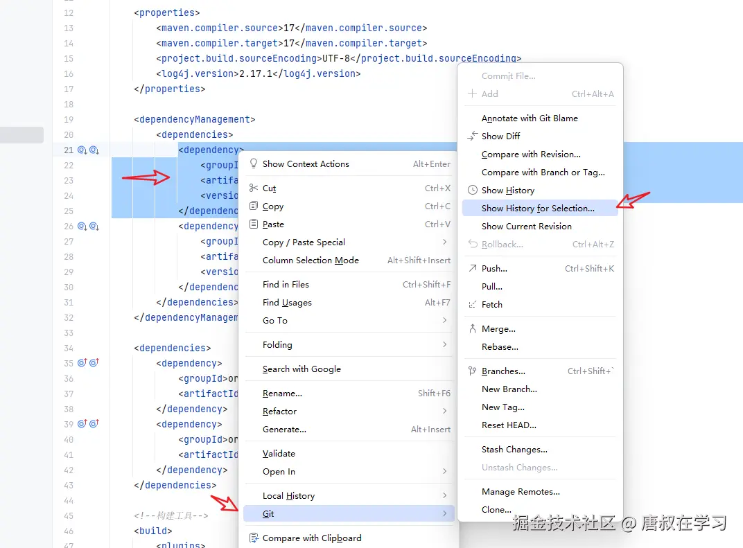📜 三、追溯代码历史:Show History for Selection