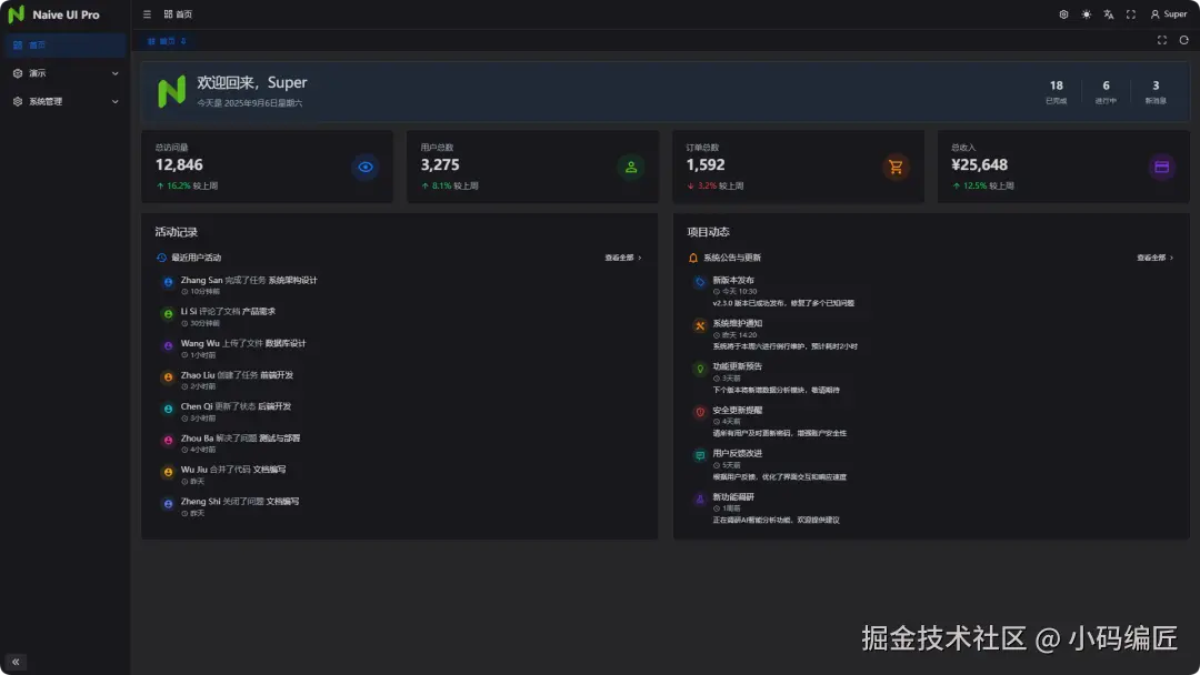 naive-ui-pro 不仅仅是一个中后台模板,更是一种新的架构思维的体现。它通过插件化设计、组件封装和底层解耦,为开发提供了一个灵活、可扩展、易于维护的开发框架。无论你是想快速搭建项目,还是想深入学习现代前端架构设计,naive-ui-pro 都是一个值得尝试的选择。