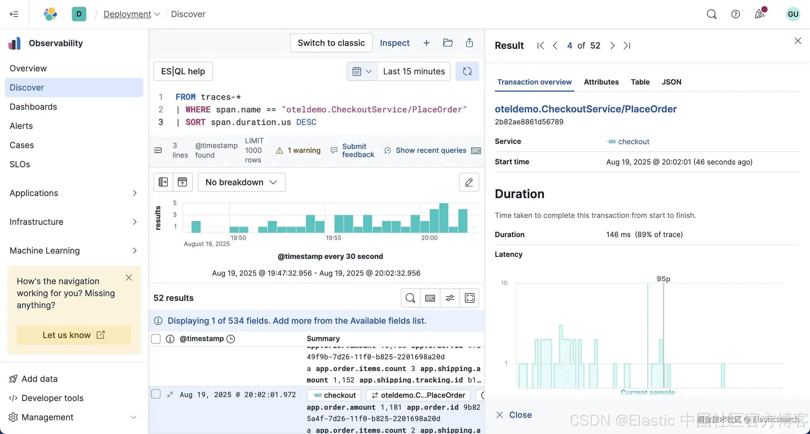 你现在可以直接在 Discover 中启动调查,通过一个广泛的 ES|QL 查询查找该特定端点的最慢事务。下面的示例使用 OpenTelemetry demo,你也可以在 OpenTelemetry demo 中自己尝试。