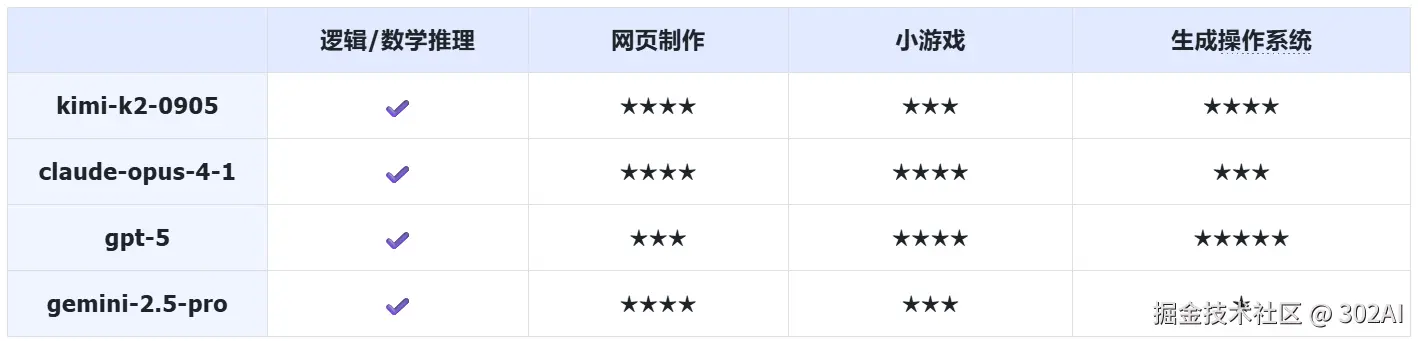 302.AI 今日已第一时间接入 Kimi-K2-0905,支持聊天机器人使用和 API 在线调用。本期内容将围绕 Kimi-K2-0905,与同领域具备代表性的 Claude Opus 4.1,GPT-5 以及 Gemini 2.5 Pro 展开实测对比,方便用户快速了解模型性能。