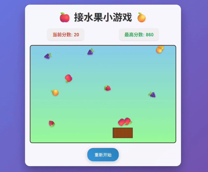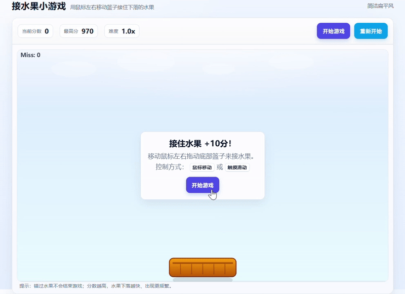 提示词:扮演一位资深前端开发工程师。请创建一个完整、可直接运行的“接水果”小游戏网页。