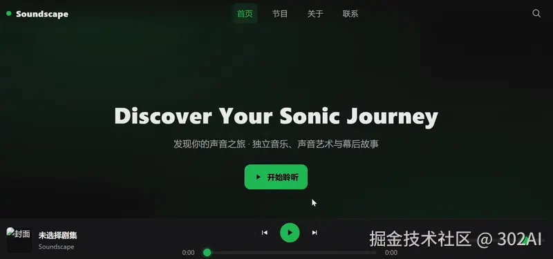 请你作为一名资深全栈工程师,使用 HTML, CSS 和 JavaScript 为一个名为“Soundscape”(声境)的独立音乐播客创建一个完整、美观、功能齐全的单页应用(SPA)风格网站。