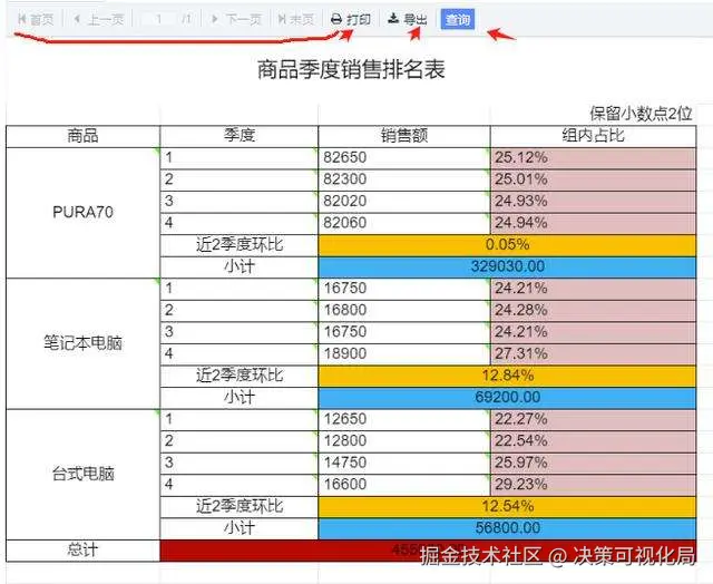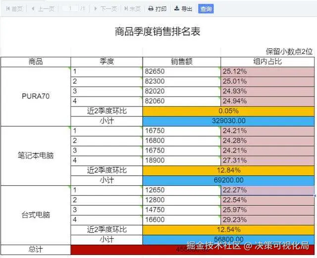 随着企业业务规模的扩大,对商品销售情况的精准掌握变得尤为重要。为此,企业亟需制作一张《商品季度销售排行榜》报表,以全面、系统地展示各商品在不同季度的销售表现。该报表需具备总计、小计功能,便于快速概览整体及细分销售数据;同时,需支持环比分析,以揭示销售趋势;此外,还需实现组内排名,明确商品在同类中的竞争力。为满足不同用户需求,报表应支持参数查询功能,允许灵活筛选数据。最后,为了方便数据传播与归档,报表需提供导出和打印功能。