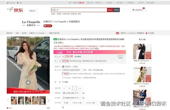 例如我们打开京东手机端或者 PC 端,搜索关键词 " 新款连衣裙",随便点击一个宝贝,进入这个商品详情,我们就以推荐的这个商品为例,点击进入商品详情页面。