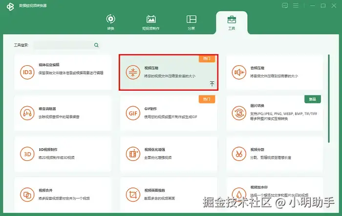 2.在【工具】界面,还有上文所说的图片格式转换、视频加水印、视频分割、GIF制作、视频速度调节等功能,你可以在搜索框快捷搜索并且使用。