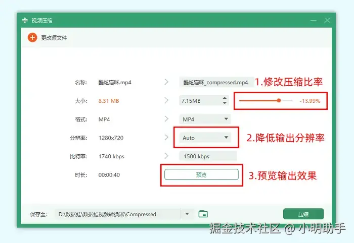 第3步: 在更改参数的操作界面中,点击拖动调节压缩比,然后还可以通过降低输出文件的分辨率进行视频压缩,调节好这两项参数之后,点击【预览】按钮可以观看前10s的输出效果。