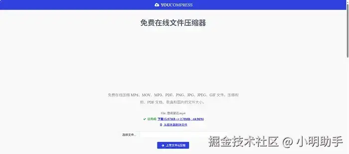 步骤:点击进入YouCompress网站首页,然后点击【选择文件】,在电脑或者手机内存中上传你的视频文件,之后点击【上传&压缩】按钮。