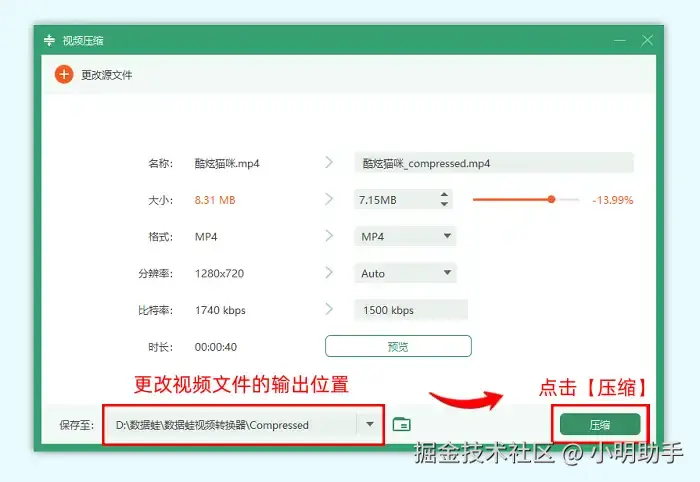 第4步: 点击【保存至】,如果我们不修改输出路径,默认是保存在数据 蛙安装目录下的Converted文件夹,可以将输出位置修改为桌面,之后点击【压缩】按钮。