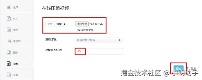 步骤: 点击进入Aconvert网站,然后点击【视频】选项卡,接下来,在网站界面的顶部任务栏中点击【压缩】选项卡,之后你可以看到如下图所示的操作界面,之后点击【选择文件】可以上传单个视频文件,修改【比特率百分比】之后,点击【提交】选项按钮。