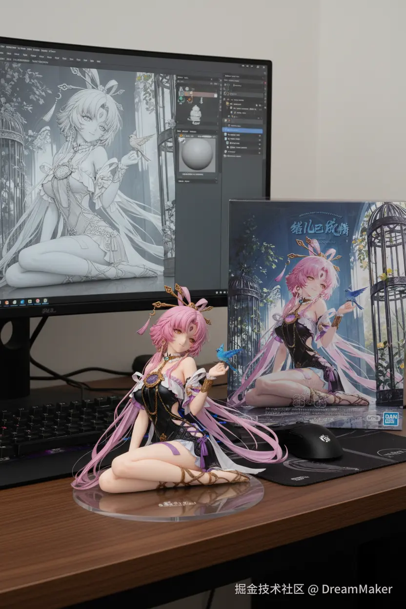 Using the nano-banana model, a commercial 1/7 scale figurine of the characterin the picture was created, depicting a realistic style and a realistic environment. The figurine is placed on a computer desk with a round transparent acrylic base. There isnotexton the base. The computer screen shows the Zbrush modeling process of the figurine. Next to the computer screen is a BANDAI-style toy boxwith the original painting printed on it.