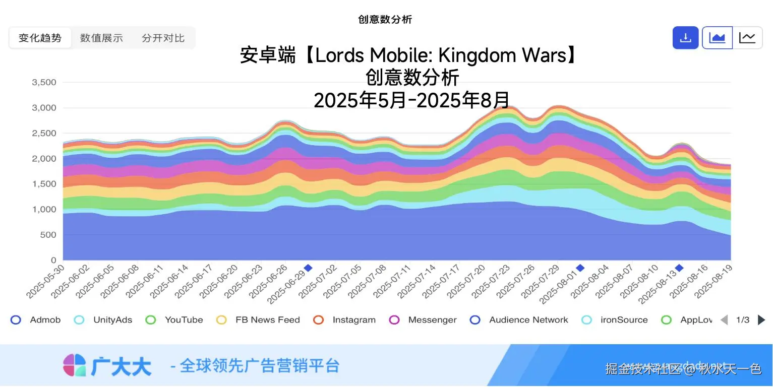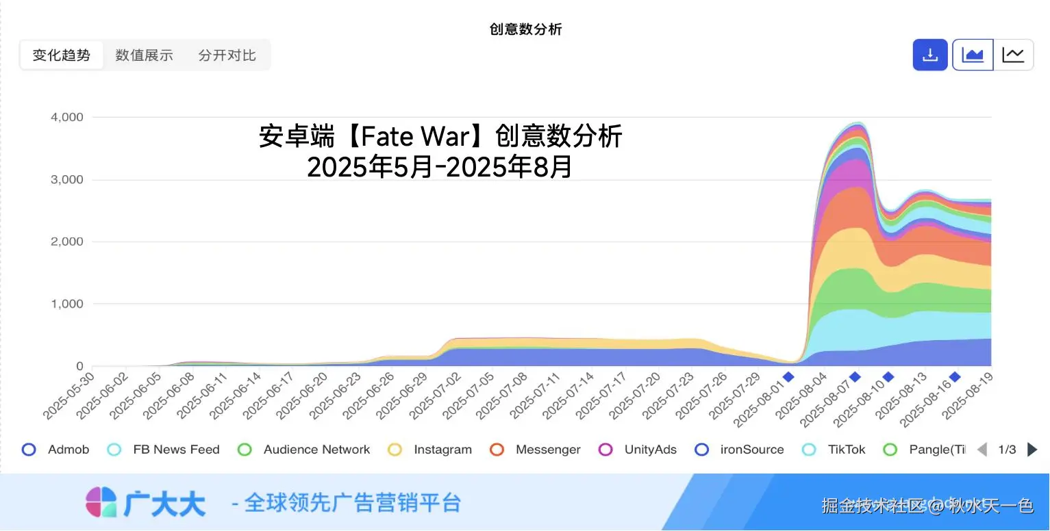 买量方面,【Fate War】从8月4日开始发力,其创意素材产出规模呈现爆发式增长,创意数甚至超过长期占据IGG营收核心地位的【Lords Mobile: Kingdom Wars】。