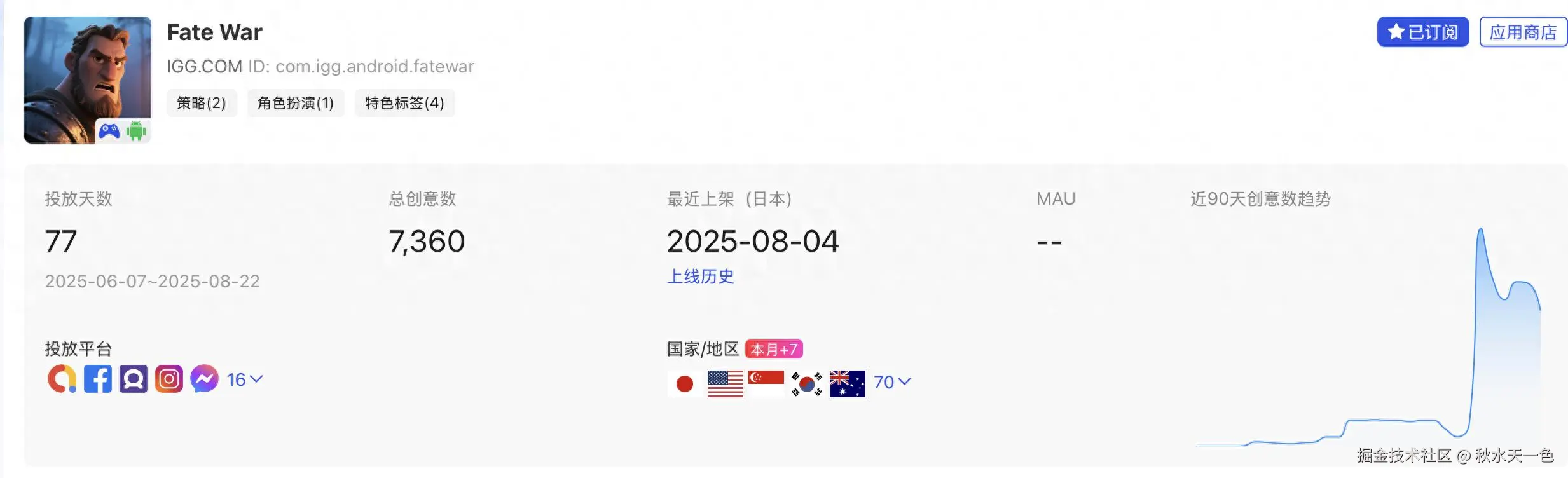 根据广大大-广告主分析功能,【Fate War】移动双端于2025年6月7日开始投放,投放天数共79天,双端累计投放去重素材超7500条,日本、美国、新加坡、韩国成为主要投放市场。