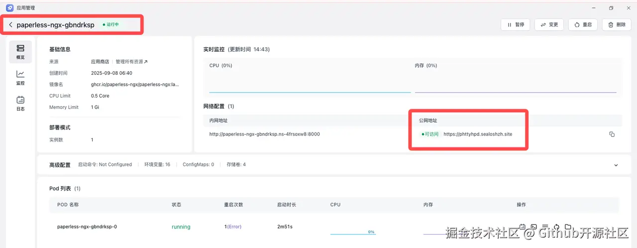 部署会花上一两分钟,在 应用管理 中找到 Paperless-ngx,当状态从“部署中”变为绿色的 “运行中” 时,就大功告成了!