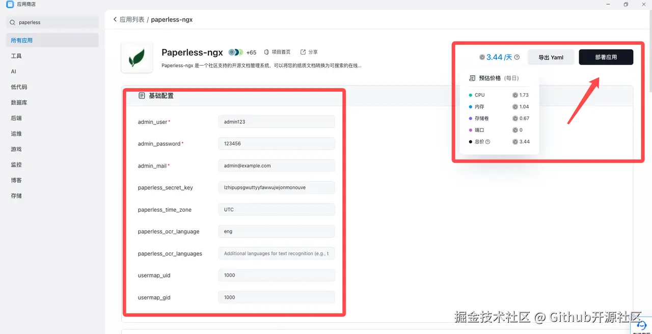 首先 输入配置初始账号与密码,然后直接点击 部署应用 就行。