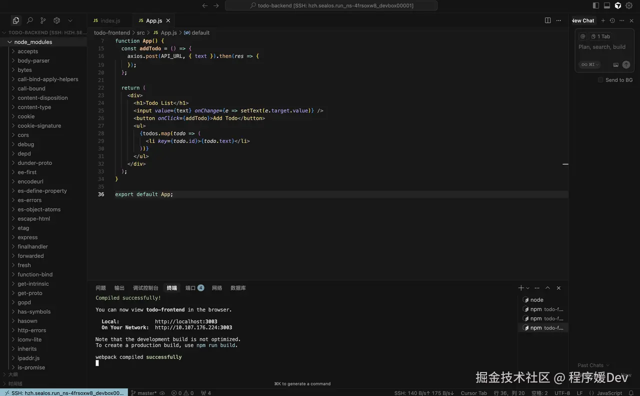 - 进入 Devbox 应用,打开我的开发环境。 页面加载出来,就是那个熟悉的 VS Code 界面,左边是文件树,下面是终端。