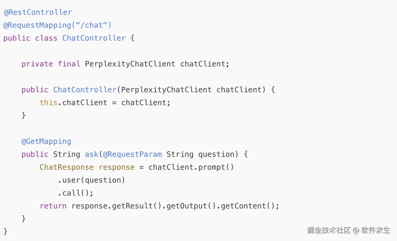 到这里,Perplexity 聊天模型就被我们完整接进 Spring Boot 里了 。