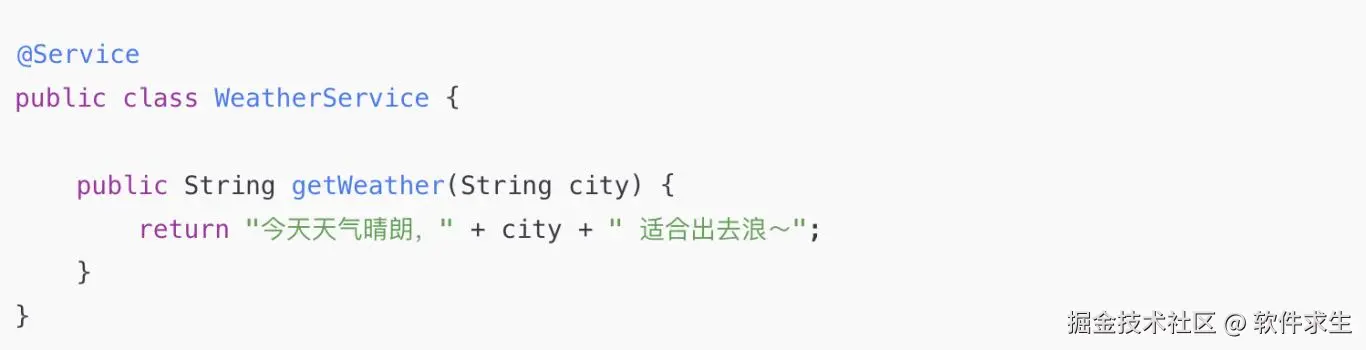 SpringAI 封装得很优雅,只需要定义接口,然后标注 @Service 即可。例如:
