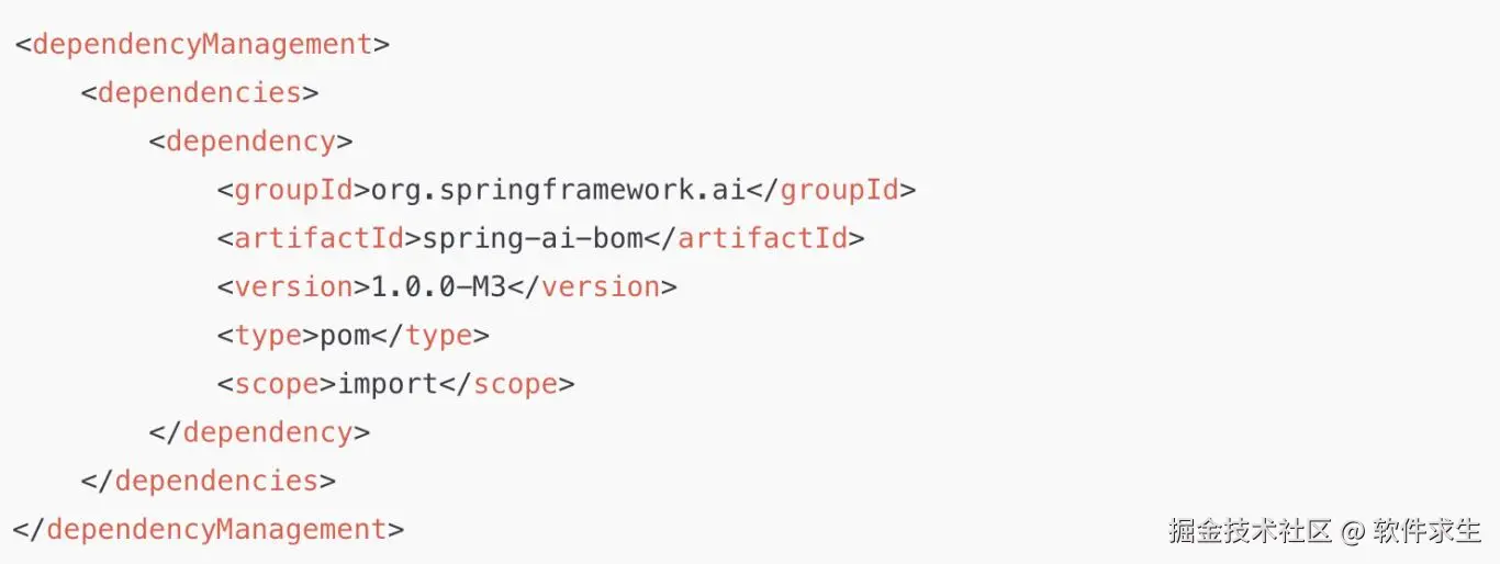 既然是 SpringAI,自然少不了在 pom.xml 里加依赖。Spring 官方已经帮我们准备了 Spring AI BOM,只需要在父依赖里加一行,就能自动管理版本。