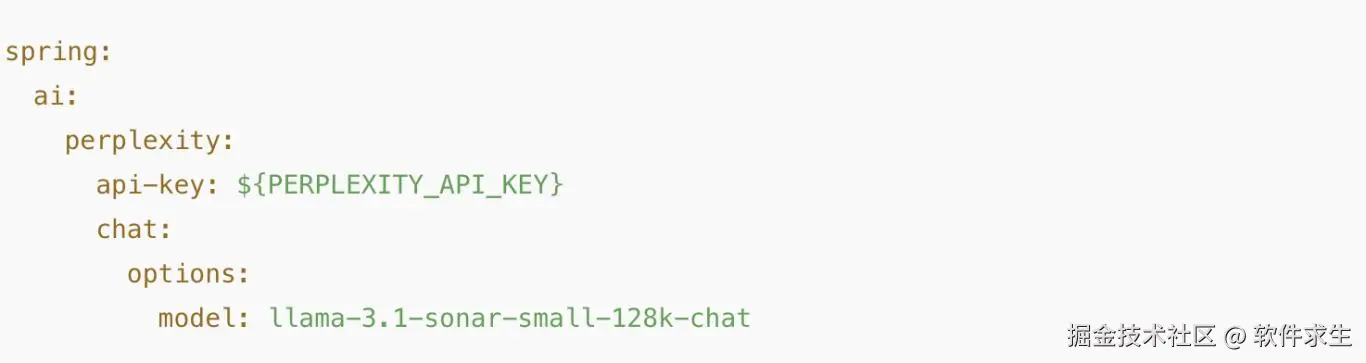 有了 starter,Spring 会自动帮我们装配 PerplexityChatClient,只要配置好 application.yml 就能用。比如: