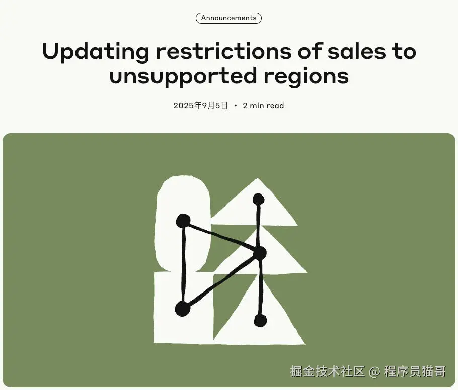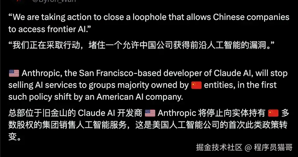 2025年9月5日,美国AI巨头Anthropic突然发布公告,宣布立即停止向多数股权由中国资本持有的公司或其子公司提供Claude服务。这项政策不仅针对中国大陆企业,还覆盖了新加坡、香港等地的中资子公司,无论其运营地点在哪个国家。