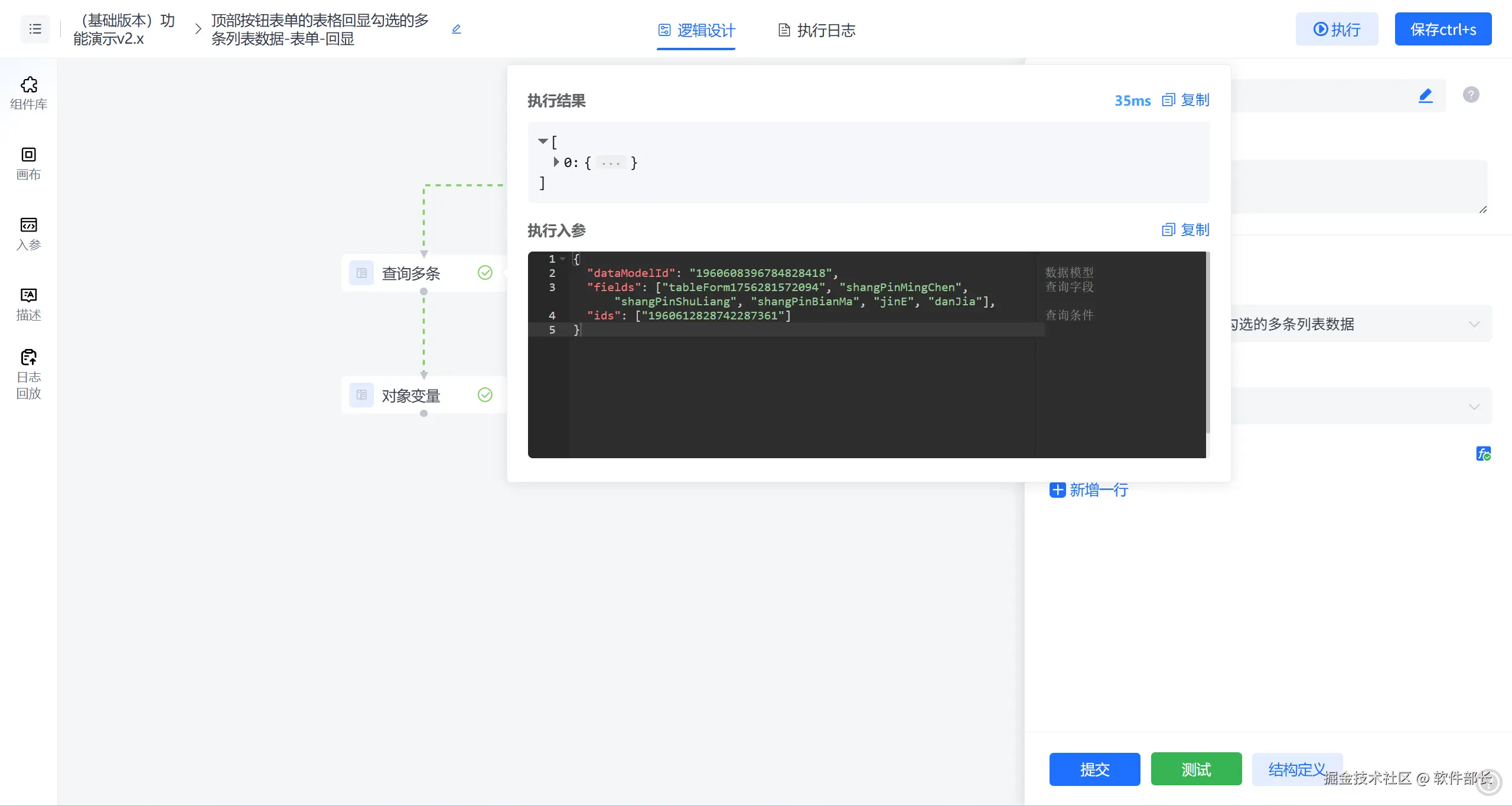 第三步:在逻辑引擎中,如下图,列表页勾选的多条数据将生成id数组传入逻辑入参
