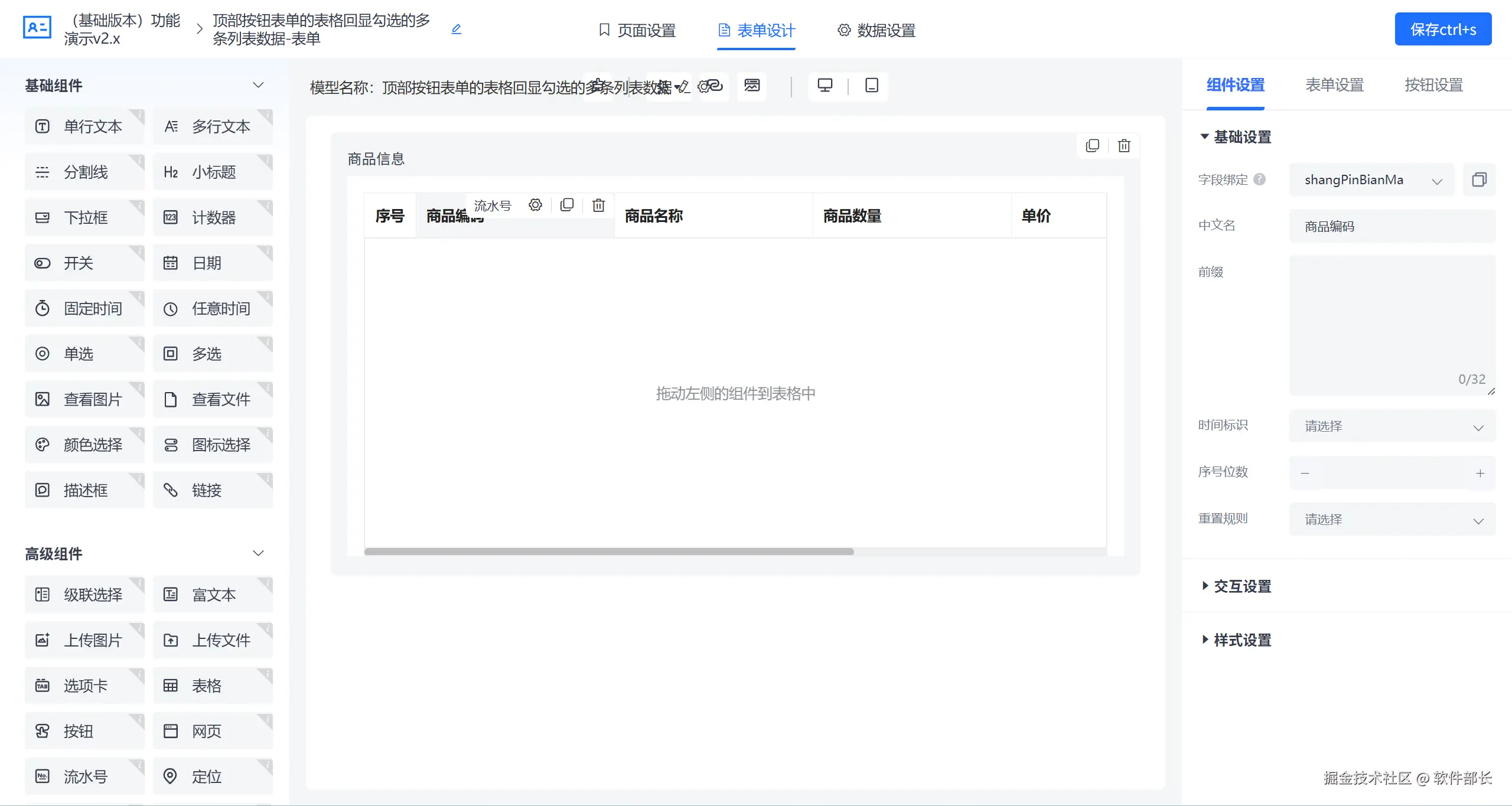 第二步:进入表单设计器,拖取表格组件,在表格中配置字段,注意:表格中的字段名要与列表字段保持一致