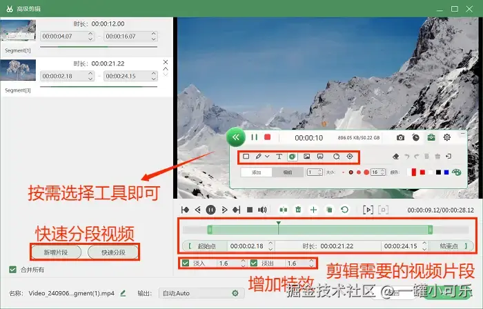 步骤3:在录制的过程中,可以用内置的工具对视频内容进行标注。录制结束后可以选择 “高级剪辑” 工具对视频进行编辑操作,如快速分段视频、增加特效等。