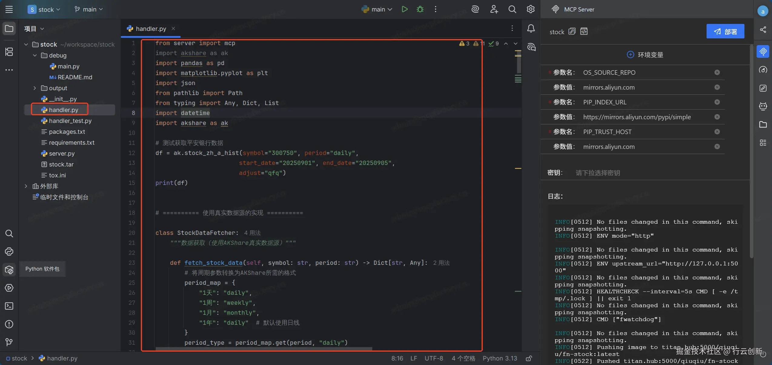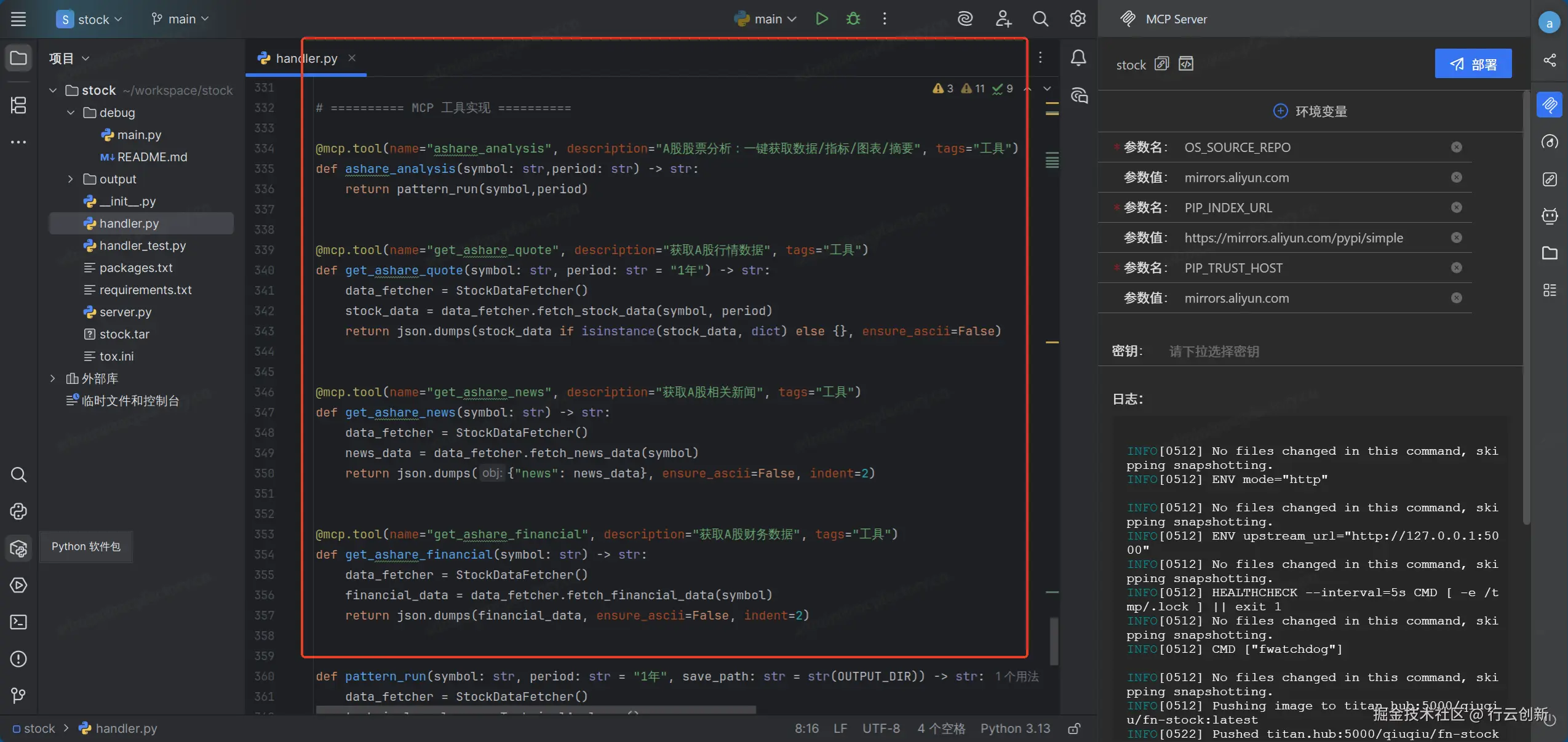 要充分发挥「Stock」的强大功能,还需要一款高效且易于使用的开发工具来辅助我进行MCP Server开发。这时,我想到了专为MCP开发而设计的MCP Factory。它基于FastMCP框架,极大简化了MCP Server的开发流程,让我只需专注于业务逻辑的实现,而无需纠缠于底层细节。借助其简洁的代码结构、一键部署能力和内置调试工具,我的开发效率显著提升,最终快速构建出了这套智能Stock分析系统。