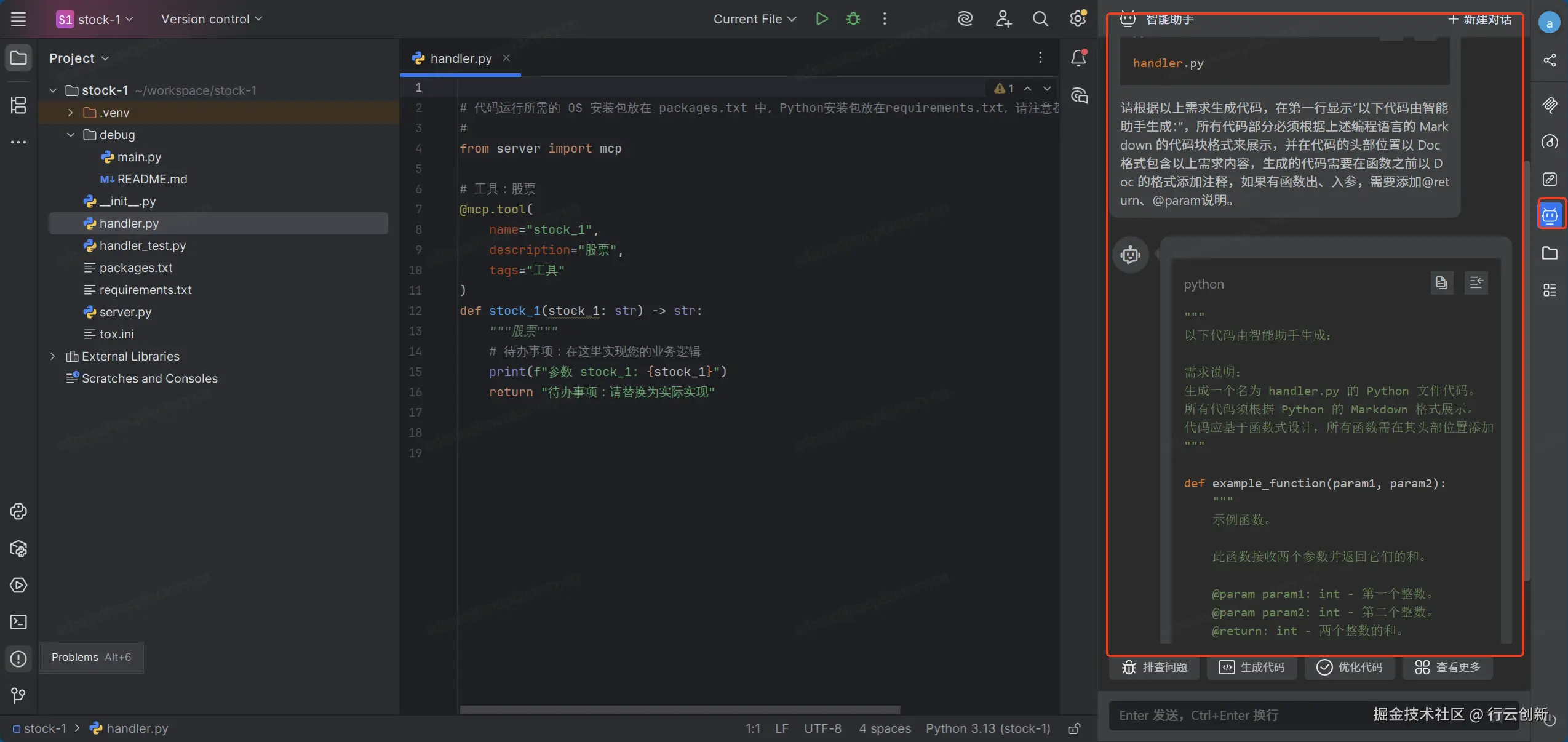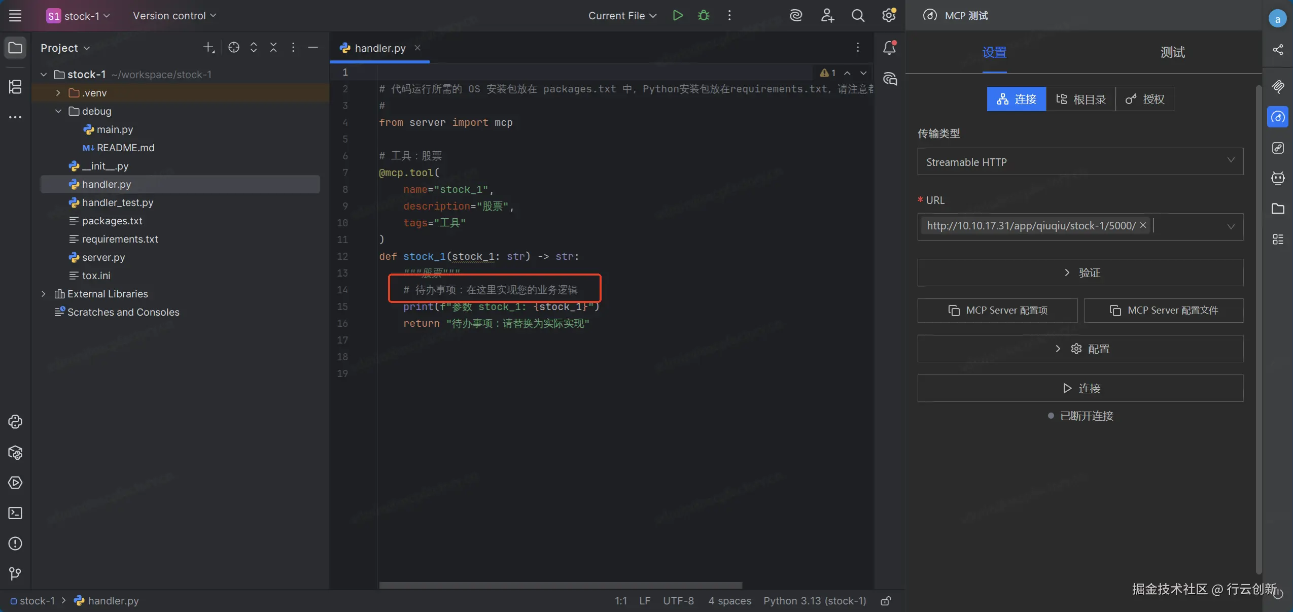 打开软件即可开始创建您的第一个MCP Server。系统会自动搭建好开发环境与基础脚手架,您只需在handler.py中编写业务逻辑,轻松实现自定义功能,快速上手无需复杂配置。