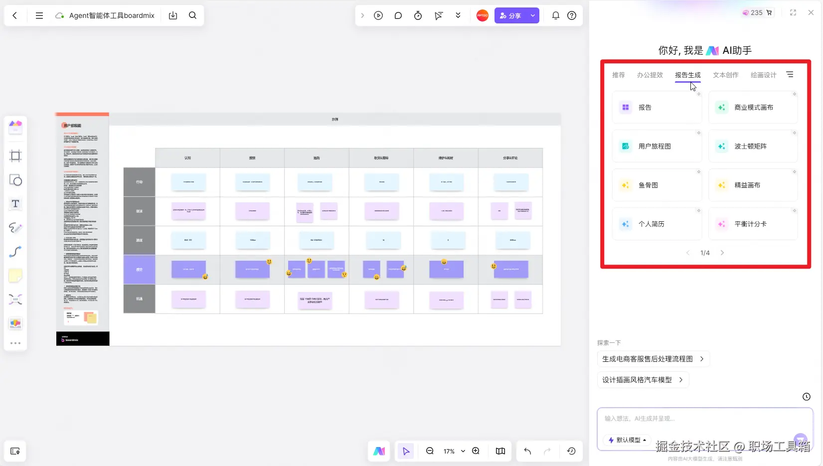 值得一提的是,boardmix预置了海量可快速生成各类可视化分析报告的AI智能体,包括商业模式画布、用户旅程图、波士顿矩阵、鱼骨图、精益画布、平衡计分卡、SMART分析、SWOT分析、波特五力模型、用户画像、亲和图、价值链、六顶思考帽、5Why分析、AARRR模型、PEST分析法、竞品分析等,使用时只需输入 。