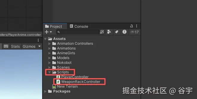 2.在 "Assets" 文件夹中,点击鼠标右键,选中“Create”,点击“Folder”,新建一个名为 "Scripts" 的文件夹(你可以根据自己的喜好来命名),然后在该文件夹里,再点击右键,选中“Create”,点击“C# Script”,创建一个武器架脚本(我这里命名为“WeaponRackController”)。
