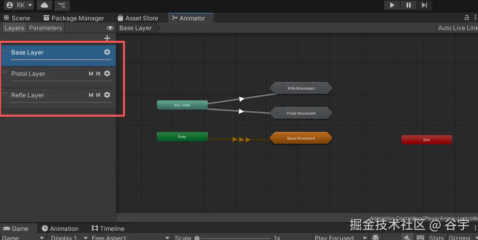 (1)首篇文章:如何配置切换武器的动画。大家可以参考《【Unity3D实例-功能-切换武器】切换武器(一)动画配置》